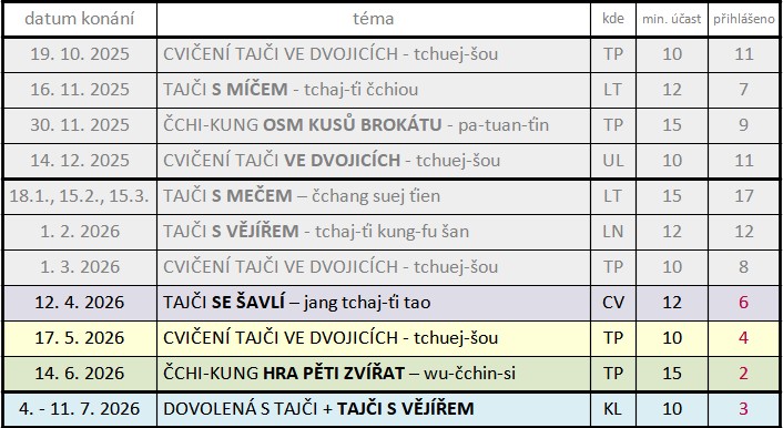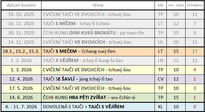 Zde najdete přehlednou tabulku plánovaných nedělních lekcí tajči a čchi-kungu. Můžete si nejen poznamenat do svých diářů, ale také se včas přihlásit.