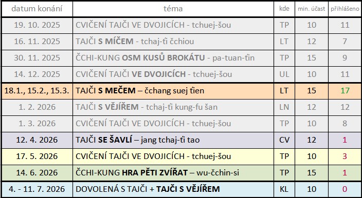 Zde najdete přehlednou tabulku plánovaných nedělních lekcí tajči a čchi-kungu. Můžete si nejen poznamenat do svých diářů, ale také se včas přihlásit.